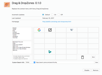 Trong phiên bản 1.1, chức năng đã được mở rộng để bao gồm các hành động menu ngữ cảnh như DropZones, cho phép người dùng thực hiện các tác vụ như sao chép hình ảnh hoặc đánh dấu liên kết trực tiếp thông qua giao diện DropZone. Ngoài ra, một nút thanh công cụ có thể được thêm vào để bật và tắt tính năng Drag & DropZones, cung cấp sự linh hoạt cho người dùng cần thực hiện các thao tác kéo và thả đa dạng. Tổng thể, tiện ích mở rộng này cung cấp một cách tiếp cận đơn giản và thân thiện với người dùng cho việc tìm kiếm trên internet.